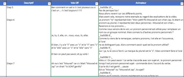 Une chose importante, la petite voix y doit y être indiquée en détail, aussi dans le déroulé de l'animateur. Ainsi il peut tenir compte des inserts voix et faire les pauses nécessaires.